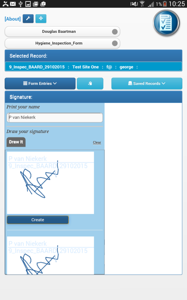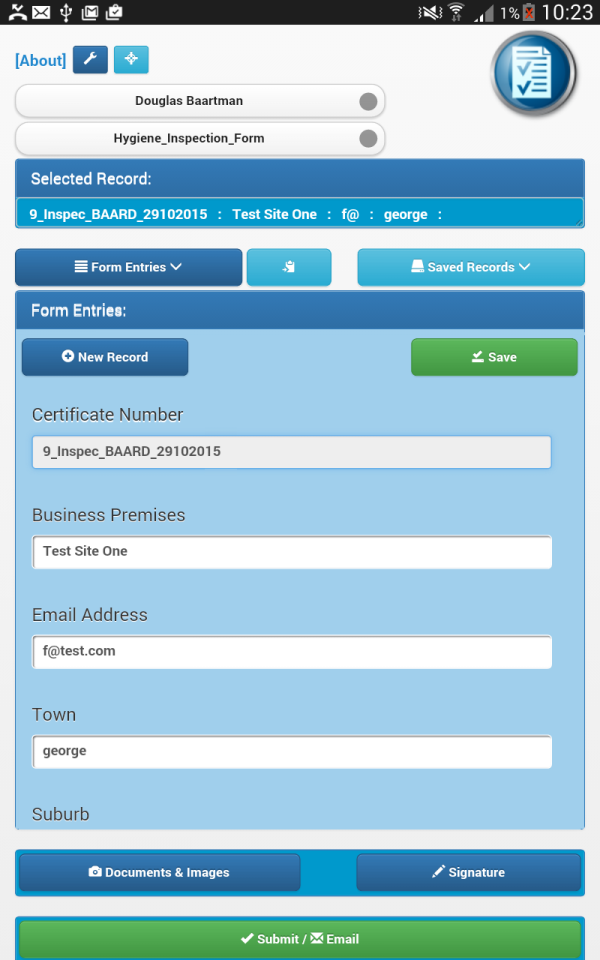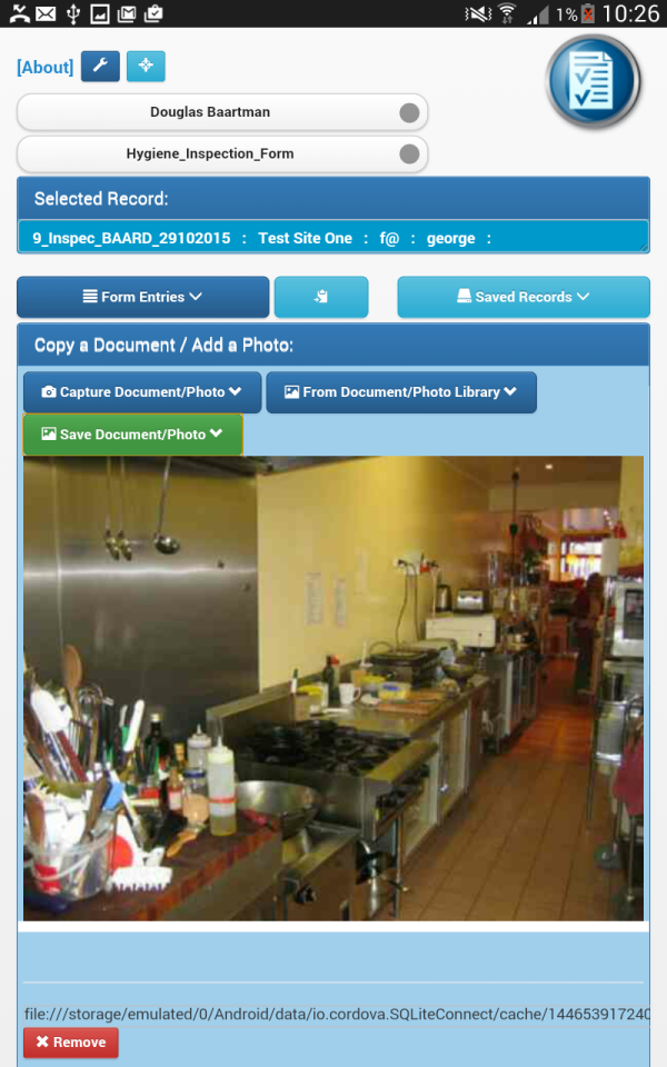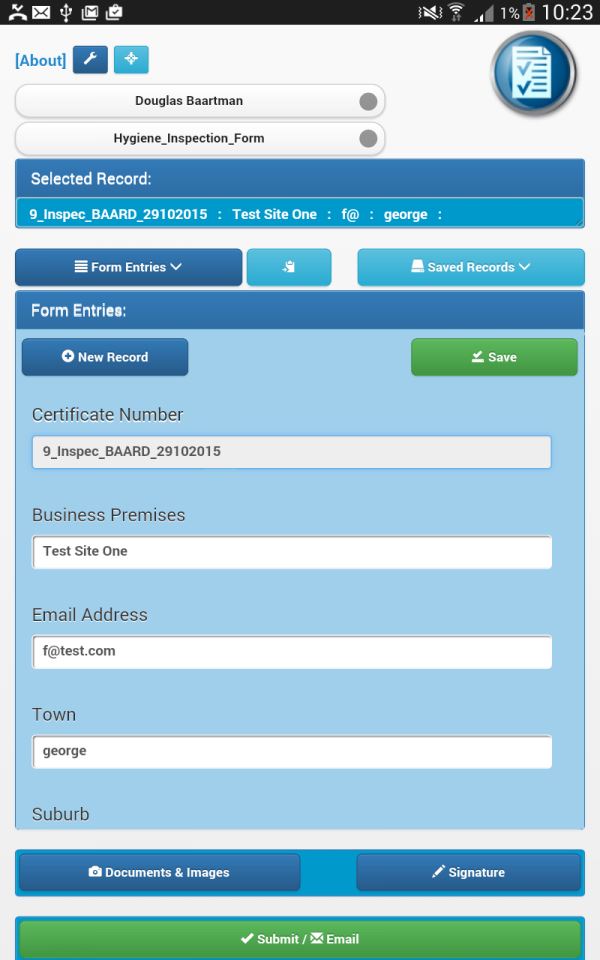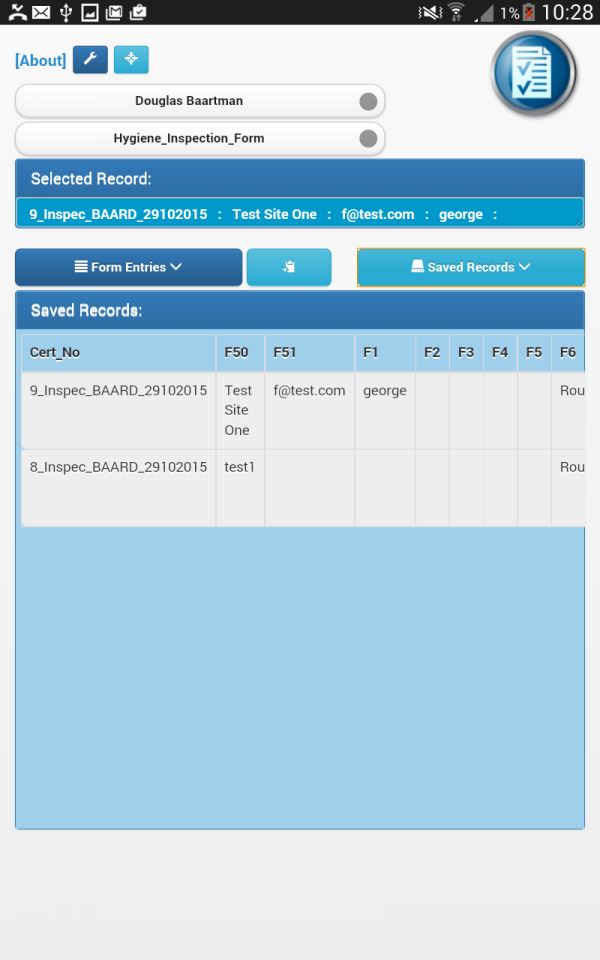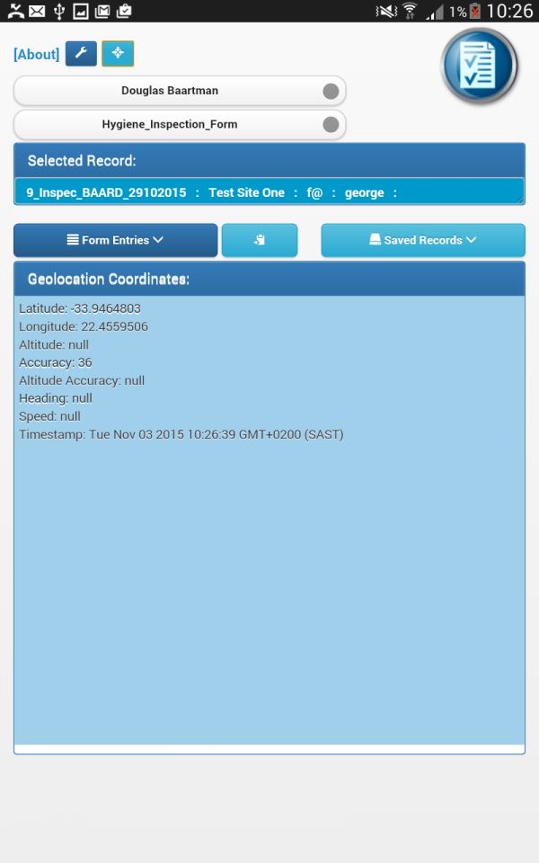 This dynamically configured application can be used to capture electronic-form information off-line, and can then be synced to the main database when in-range. All data are stored on the device's internal database, and all records can be browsed via a table-view on the device itself.